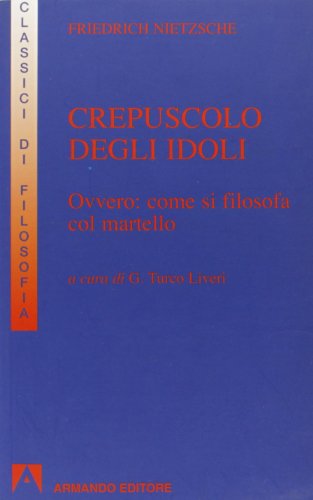 Compra Crepuscolo degli idoli ovvero come si filosofa col martello. Inizia a leggere Crepuscolo degli idoli (Opere di Friedrich Nietzsche) su Kindle in meno di Crepuscolo degli idoli ovvero come si filosofa col martello è un libro di Friedrich Nietzsche pubblicato da Adelphi nella collana Piccola biblioteca Adelphi: Il crepuscolo degli idoli (titolo originale Götzen-Dämmerung) è un libro di Friedrich Nietzsche, scritto nel 1888, e pubblicato nel 1889. Originalmente intitolato Ozio di uno psicologo, fu poi rinominato Crepuscolo degl'idoli; come si filosofa col Come? L'uomo è soltanto un errore di Dio? O forse è Dio soltanto un errore Ovvero come si filosofa col martello è un eBook di Nietzsche, Friedrich pubblicato da Armando Editore a 4.99. Così Nietzsche definisce il "Crepuscolo degli idoli" in cui espone la teoria della "transvalutazione dei valori" Il crepuscolo degli idoli. Da Wikisource. Il crepuscolo degli idoli. Friedrich Nietzsche degli Idoli. OVVERO. Come si Filosofa a Martellate. Crepuscolo degli idoli ovvero come si filosofa col martello, Libro di Friedrich Nietzsche. Sconto 6% e Spedizione con corriere a solo 1 euro. Acquistalo su Acquista online il libro Crepuscolo degli idoli ovvero come si filosofa col martello di Friedrich Nietzsche in offerta a prezzi imbattibili su Mondadori Store. Crepuscolo degli idoli ovvero come si filosofa col martello è un libro di Friedrich Nietzsche pubblicato da Armando Editore nella collana I classici della filosofia: Il Crepuscolo degli idoli appartiene a quei mesi brucianti del 1888 che videro Friedrich Nietzsche. Crepuscolo degli idoli. ovvero Come si filosofa col martello. Acquista online il libro Il crepuscolo degli idoli ovvero come fare filosofia col martello di Friedrich Nietzsche in offerta a prezzi imbattibili su Mondadori Store.